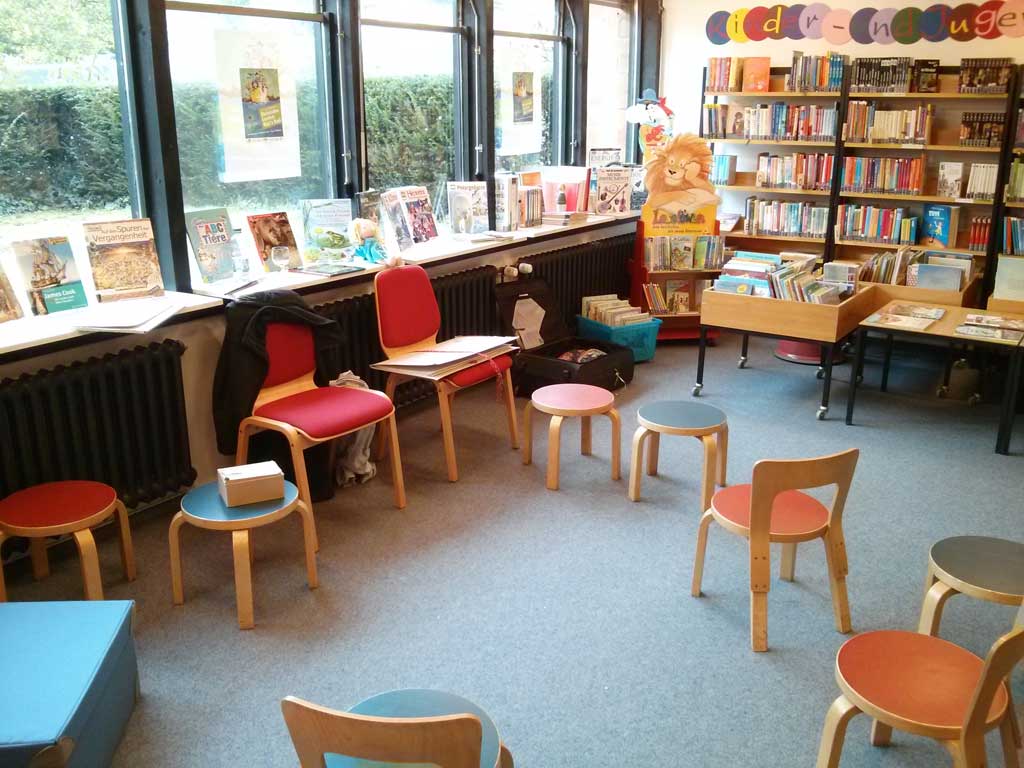 Danach ging es wieder Richtung Godesberg (falls das schon Godesberg ist). Auch hier erwartete mich ein Saal mit Stühlen und Lesetisch, auch hier war es kein Problem, für mich die Vorleseecke in der Bibliothek aufzubauen. Das war wirklich sehenswert- im perfekten Zusammenspiel wurden Regale (mit Rollen) und Bücherkisten zur Wand geschoben, so dass Raum zum Vorlesen entstand.
